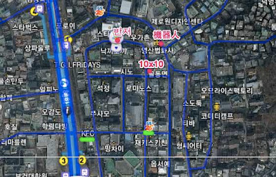 乘坐地鐵從4號線惠化站2號出口出來,在KFC的街口向右轉前行,大約120米處看到GS25便利店後向左轉,前行100米後即可看到10×10大學路店。